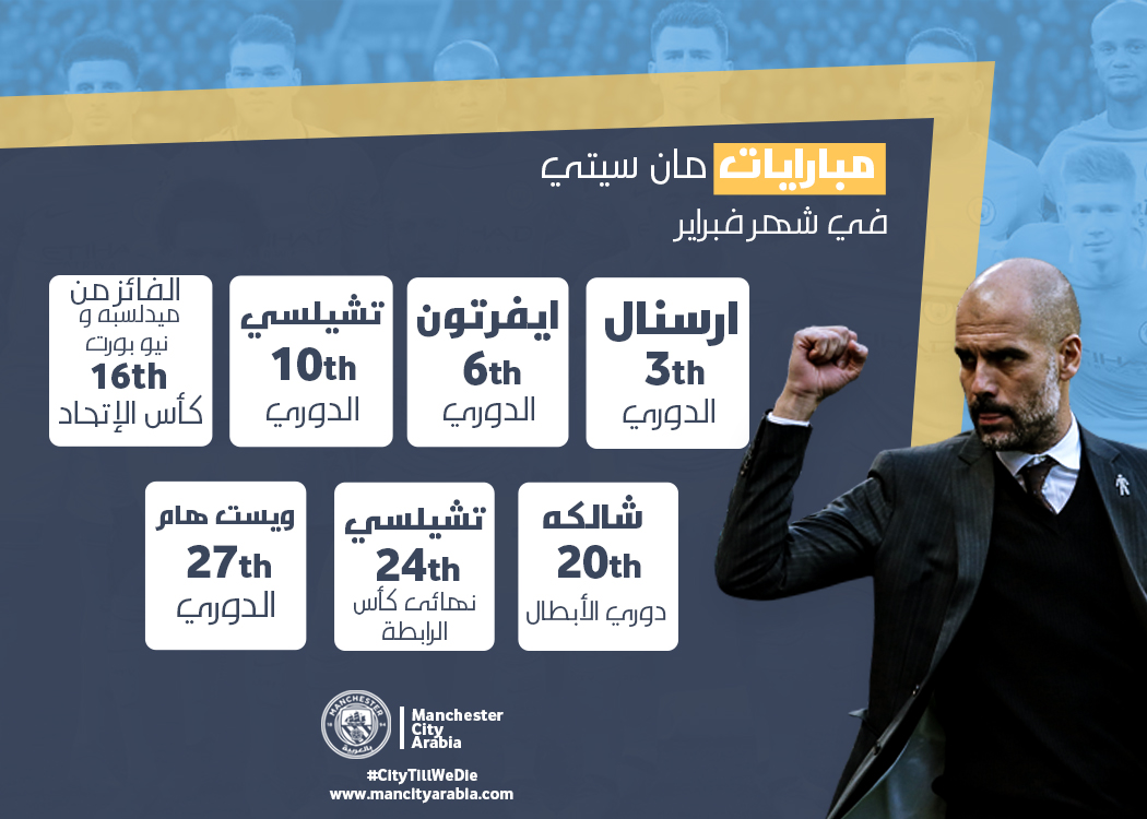 ينتظر مانشستر سيتى جدول قوى من المباريات لشهر فبراير 2019 فى جميع البطولات ويستعرض الموقع العربى لمانشستر سيتى جدول المباريات وهو كالأتى :